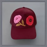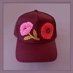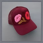 Burgundy Trucker-style twill hat with mesh & adjustable tab. Medium profile.