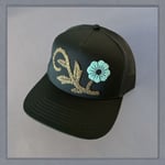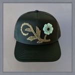 Forest Green Trucker-style twill hat with mesh & adjustable tab. Medium profile.